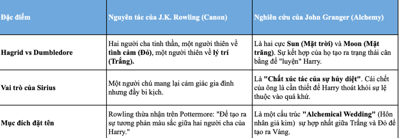 Truy vết: Nếu anh em muốn tìm hiểu sâu về khái niệm "Giả kim thuật văn chương", hãy ghé qua Hogwartsprofessor.com của John Granger người được tờ TIME mệnh danh là "The Dean of Harry Potter Scholars" (Trưởng khoa học giả Harry Potter). Ông ấy là người đầu tiên chứng minh được J.K. Rowling đã "vay mượn" cấu trúc huyền học này chuẩn xác đến mức nào.