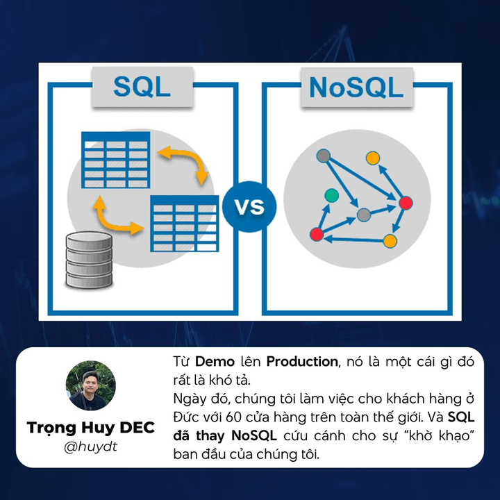 Nghề lập trình là cái nghề so đo, tính toán, cân nhắc thiệt hơn nhiều nhất trong các nghề mà tôi biết. Tại sao ư? Tại vì tôi chưa làm nghề gì khác ngoài những việc liên quan đến lập trình =))) Nhìn lại, từ khi bước chân vào nghề là đã phải một đống lựa chọn được đưa ra: Theo hệ thống thông tin hay theo kỹ thuật phần mềm, theo Java hay theo C#, theo Web hay theo App, Theo Backend hay là Frontend. Đó mới chỉ là bước khởi động để lựa chọn vào nghề, vào nghề rồi thì lại một đống công nghệ xuất hiện cạnh tranh với nhau, thay thế nhau hoặc xâm lấn chức năng của nhau. Thế là một loạt các diễn đàn xuất hiện để tranh cãi, phản biện, bao biện với nhau về những cái mình đang làm.Ngày tôi mới đi làm cũng vậy, thông tin chưa được nhiều, và tôi cũng chưa đủ kiến thức để có cái nhìn đúng đắn, đứng trước hàng loạt những lựa chọn về công nghệ cho bài toán cần triển khai, cái đầu tiên tôi phải đối mặt là xây dựng Database với SQL hay là NoSQL. Ngày ấy NoSQL nổi lắm, cái gì cũng NoSQL, quảng cáo thì bá cháy, nhanh, gọn, dễ làm, và hiển nhiên nó chiếm trọn tâm trí của một cậu chàng lập trình viên trẻ ưa cái mới như tôi. Cũng ngày đó, chúng tôi nhận được một dự án làm hệ thống gợi ý cho khách hàng bán đồ trang sức bên Đức, họ lúc đó có đến 60 stores trên toàn thế giới, việc của chúng tôi là phân tích hành vi của khách hàng và đưa ra các box gợi ý các sản phẩm. Để làm được việc ấy thì chúng tôi cần có một database lưu thông tin các sản phẩm về nhẫn, kim cương, vòng, … Ban đầu khách hàng đưa chúng tôi một tập thông tin các sản phẩm mặc định (tên sản phẩm, giá, màu sắc, option, …) để chạy thử trên một store trước khi lên production và rollout ra 60 stores trên toàn thế giới. Đề bài cơ bản là vậy, chả phải nghĩ nhiều, tôi tống hết các thông tin đó vào trong MongoDB, ở nơi đó, mỗi document là một sản phẩm chứa đầy đủ hết thuộc tính của một sản phẩm trang sức: Tên sản phẩm, mô tả sản phẩm, danh mục của sản phẩm, giá sản phẩm, màu sắc, loại kim cương, …Ấy thế là trong 3 tháng, chúng tôi đã xây dựng xong một hệ thống recommendation (phần nhiều công việc nằm ở ở thuật toán gợi ý). Demo thành phẩm với khách hàng, các ông Tây lông khá là chim ưng, họ đã đồng ý cho chúng tôi triển khai hệ thống lên production và rollout cho 60 quốc gia, đồng thời yêu cầu đội IT bên họ cung cấp đầy đủ dữ liệu để chúng tôi có thể triển khai hệ thống một cách độc lập. Một sự support rất tuyệt vời, và cờ đến tay thì anh em phất thôi, thế là lúc ấy, tôi hừng hực khí thế vào triển khai dự án với một sự tự tin mà đến bây giờ tôi vẫn chưa có được bằng ngày đó