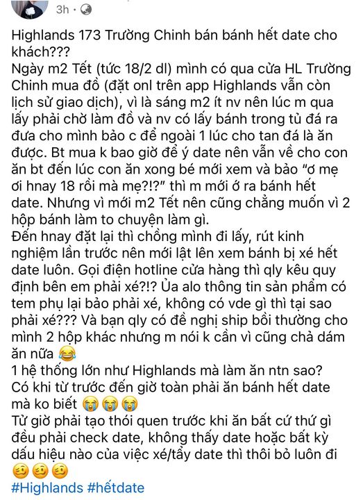 Tối nay mùng 10 Tết, tôi đọc được một chia sẻ. Một gia đình mua bánh ở một cửa hàng thuộc chuỗi lớn vào mùng 2 Tết. Bánh được lấy từ tủ đá ra, dặn để ngoài cho tan đá rồi ăn. Đến khi ăn xong mới phát hiện đã hết hạn đúng ngày đó. Và tối mùng 10 đặt mua lại, rút kinh nghiệm kiểm tra trước thì phần thông tin hạn sử dụng trên tem phụ đã bị xé mất. Khi gọi hỏi, quản lý trả lời: “Quy định bên em phải xé.”