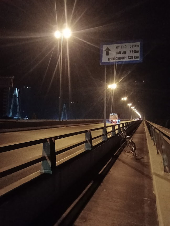 Hai chữ A sừng sững giữa vùng trời tối tăm, cầu Mỹ Thuận 2 đang được xây dựng ngay gần bên cầu Mỹ Thuận. Ngay trên hai đại công trình hàng ngàn tỷ ấy, là một cậu người nhỏ bé và một chú xe đạp già cỗi.