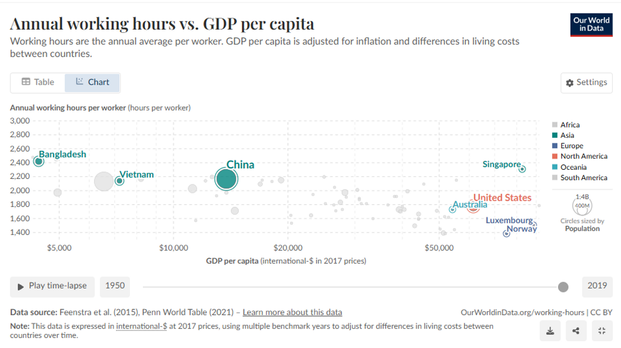Đây là biểu đồ so sánh trung bình số giờ làm việc của người lao động ở mỗi quốc gia trên thu nhập bình quân đầu người của quốc gia đó. Chúng ta có thể thấy người lao động Việt Nam có thể được xem là chăm chỉ khi thời tổng thời gian làm việc trung bình trên năm là gần 2,200 giờ nhưng thu nhập của chúng ta chỉ rơi vào 7,218 USD/ người. Trong khi một số nước có số giờ làm việc dưới 1,900 giờ/ năm lại có GDP bình quân đầu người cao gấp gần 7 lần chúng ta như Mỹ, Úc, Luxembuourg. Phần còn lại, Bangladesh có số thời gian làm việc trung bình cao hơn cả người Việt, 2,419 giờ / năm, nhưng thu nhập của họ là dưới 5,000 USD/ đầu người. Bạn có thể tham khảo thêm ở link này nhé. Nói vậy để thấy, làm nhiều chưa chắc đã giàu và làm ít chưa chắc đã nghèo. Về phần thứ hai, đúng là việc "chăm vườn" sẽ đòi hỏi bạn phải bỏ ra một chút của cải mà bạn đã khó khăn lắm mới kiếm được. Tuy nhiên, hãy nhớ rằng, nhân quả có thể phát triển theo cấp số nhân, một hạt cây nhỏ bé nếu được chăm bón đúng cách có thể tạo ra một cái cây to lớn, thậm chí là cả một khu rừng. Và hãy nhớ kĩ, vấn đề sẽ không bao giờ là bạn cho đi bao nhiêu, mà là bạn đã rộng lượng như thế nào, bạn cho với tâm thế nào, nói cách khác là bạn chăm sóc cái "vườn cây linh hồn" của mình như thế nào để các hạt giống nảy mầm. Điều này quan trọng hơn rất nhiều.