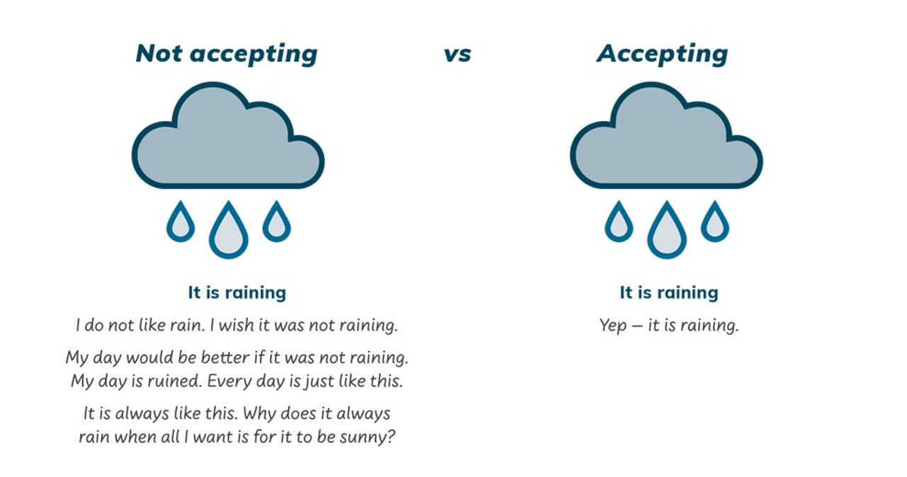 - Mọi người thường nghĩ rằng chấp nhận là phải đồng tình với thực tế đang diễn ra. Nhưng không, chấp nhận không có nghĩa là chúng ta cảm thấy những thực tế không mong muốn này là những điều tốt hay dễ chịu cả.