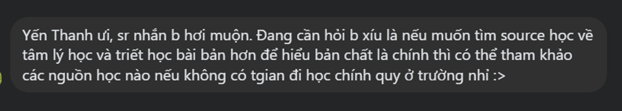 Hiện tại thì song song việc tự học, mình đang là sinh viên Tâm lý học hệ Vừa học vừa làm ở Trường KHXH&NV Hà Nội.