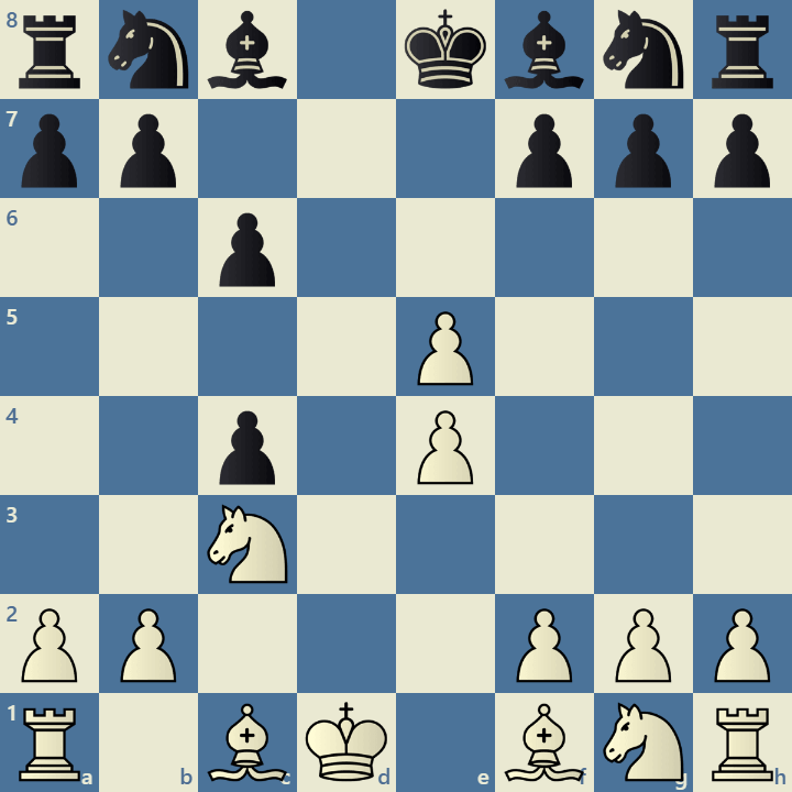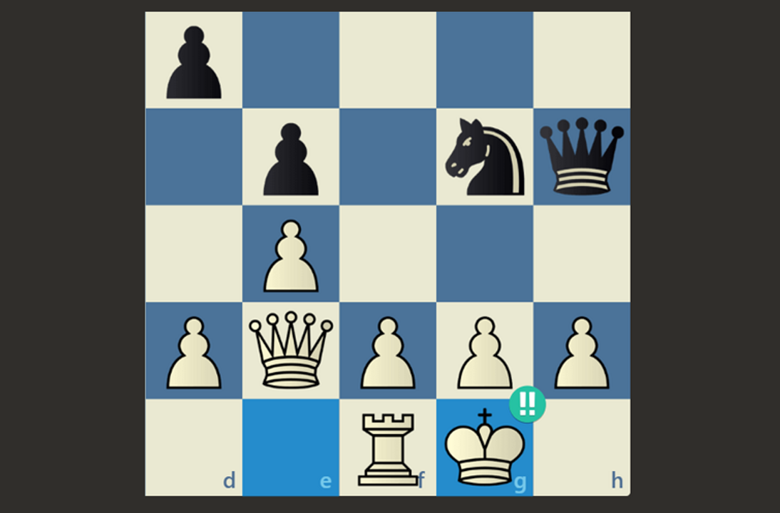 Tuy nhiên, Trắng, với kinh nghiệm giải đố dày dặn trên chess.com đã ngay lập tức nhìn ra mánh khóe rẻ tiền này và không chọn bắt quân mã ở e4 ngay. Trắng thấy mình có thể tước đi quyền nhập thành của Đen bằng cách sử dụng quân tượng.