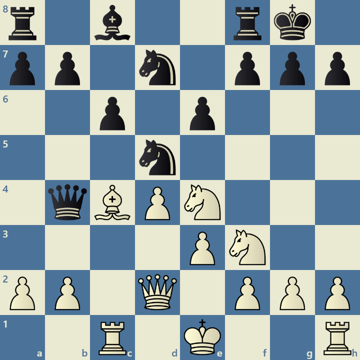 8. Bd3 dxc4 9. Bxc4 Nd5 10. Bxe7 Qxe7 11. Ne4 Qb4+ 12. Qd2 (hình dưới)
