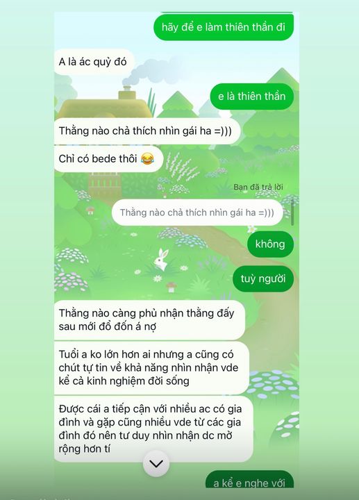 Mình đang nhắn tin với P, nhưng mình chẳng dám yêu. Sợ sinh hận. P theo dõi hay like ảnh nyc, có thêm kết bạn là nữ hay gì, mình cũng mặc kệ. Không lồng lộn, không hỏi nữa, cũng chẳng đòi quyền lợi. Vì mình thích cậu ta, trong quá khứ nhiều khi mình cũng ích kỷ, lúc buồn lại tìm đến họ, họ cũng tâm sự với mình nhiều chuyện, nên thôi để P thoải mái.
