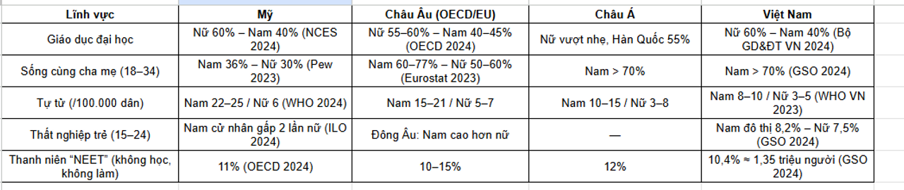 Ở Việt Nam, bất bình đẳng giới vẫn tồn tại (nữ kiếm trung bình 82% thu nhập nam), nhưng nam giới lại chịu thiệt ở mặt tinh thần. Sự mất cân bằng này không phải cuộc chiến giới mà là dấu hiệu của xã hội hậu công nghiệp chưa kịp tái định nghĩa nhân tính.