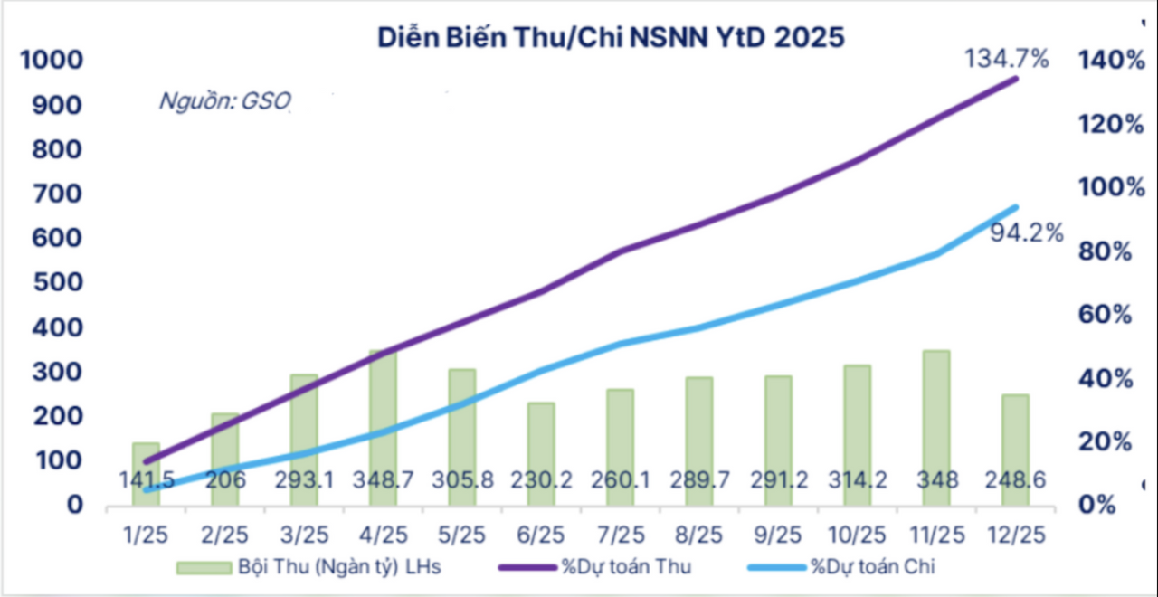 Như các độc giả có thể quan sát ở Hình 1, bức tranh thu – chi ngân sách năm 2025 cho thấy Việt Nam ghi nhận trạng thái bội thu ngân sách. Xét trên góc độ chính sách, bội thu là tín hiệu tích cực đối với chính sách tài khóa, phản ánh kỷ luật ngân sách được cải thiện cũng như dư địa điều hành tài khóa tương đối tốt hơn.