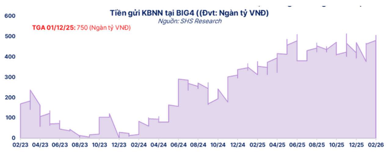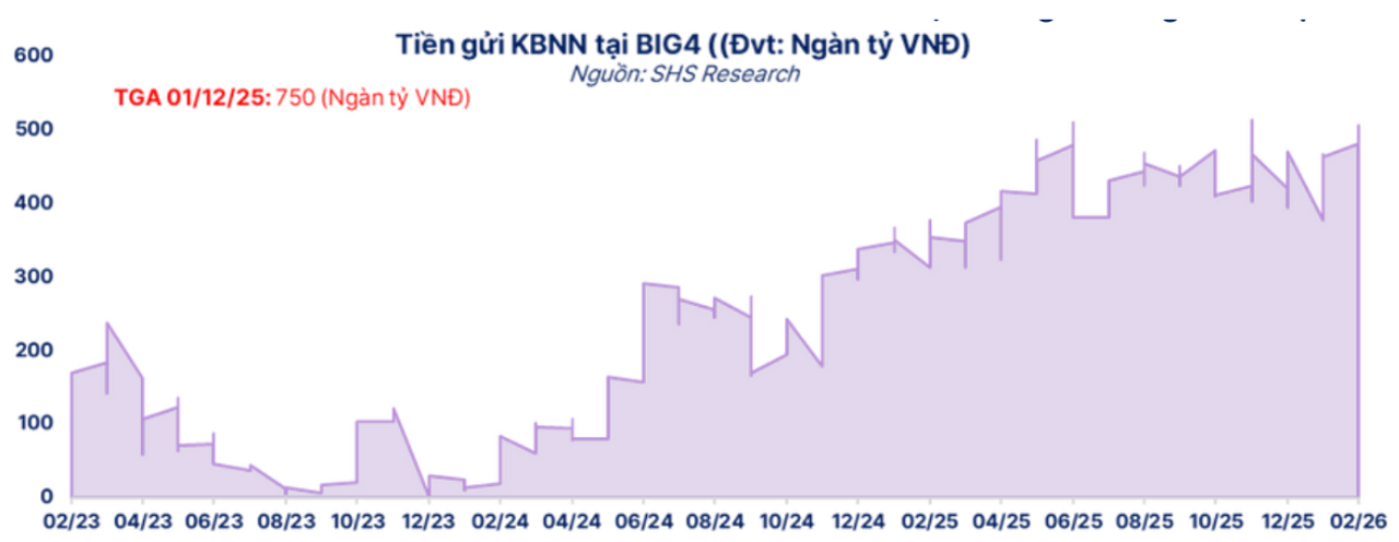 Song song với đó, một yếu tố hỗ trợ quan trọng khác đến từ dòng tiền của Kho bạc Nhà nước tại nhóm ngân hàng Big4. Sau khi trần phân bổ tiền gửi được điều chỉnh từ 50% lên 60% trong khuôn khổ cơ chế Ngân quỹ Nhà nước, KBNN đã nhanh chóng đẩy mạnh hoạt động đấu thầu tiền gửi ngay từ đầu tháng 2 nhằm hỗ trợ thanh khoản trong bối cảnh thị trường chịu áp lực gia tăng. Theo các ước tính hiện tại, quy mô tiền gửi của KBNN tại nhóm ngân hàng này đã tiến sát ngưỡng tối đa cho phép.