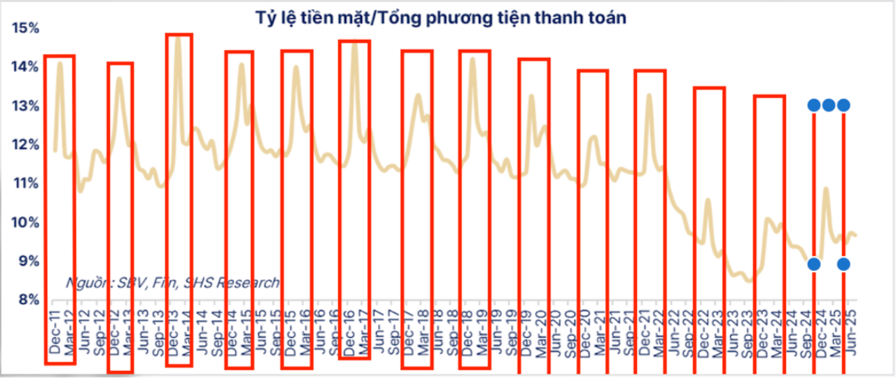 Các độc giả có thể dễ dàng nhận thấy rằng, hầu như năm nào cũng vậy, trong giai đoạn từ tháng 12 đến khoảng tháng 3 năm sau, nhu cầu nắm giữ tiền mặt lại gia tăng rõ rệt. Khoảng thời gian này trùng khớp với chu kỳ Tết Âm lịch tại Việt Nam, qua đó tạo nên một hiện tượng mang tính lặp lại khá nhất quán qua nhiều năm.