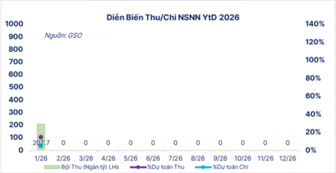Bức ảnh phía trên phản ánh diễn biến thu – chi ngân sách trong năm 2026, và các độc giả có thể dễ dàng nhận thấy rằng ngay từ đầu tháng 1, ngân sách Nhà nước đã rơi vào trạng thái bội thu. Nguyên nhân chủ yếu đến từ yếu tố thời điểm, khi chu kỳ nộp thuế của doanh nghiệp thường đạt đỉnh vào cuối tháng Giêng, khiến dòng tiền ngân sách tăng mạnh trong giai đoạn đầu năm.