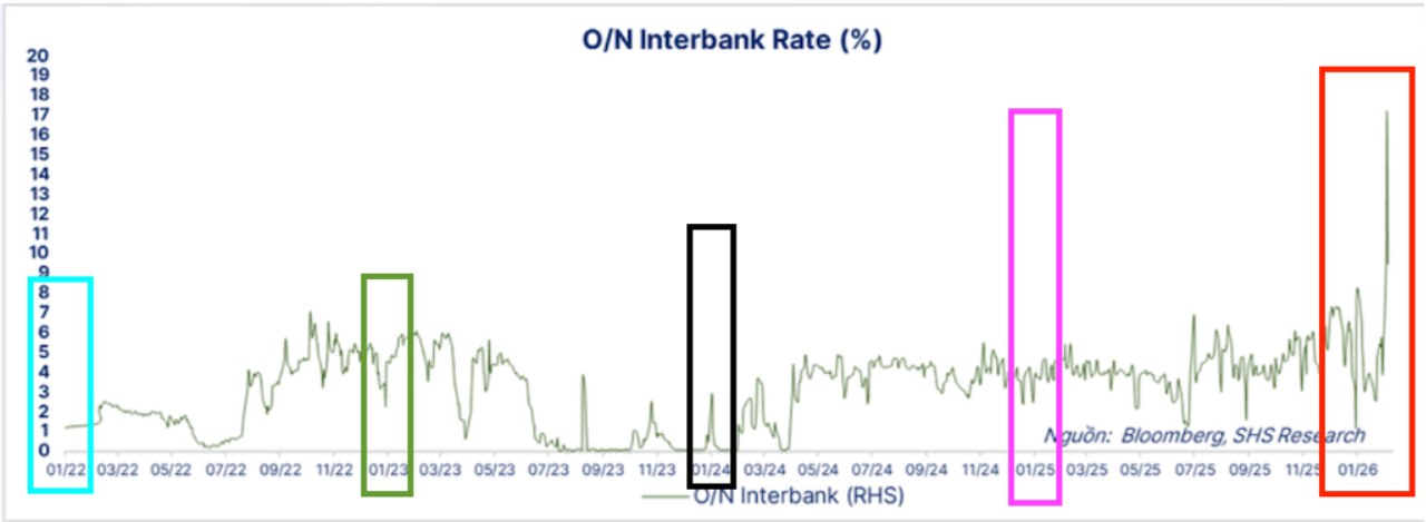 Trong bối cảnh đó, để bù đắp cú sốc Cash-out mang tính chu kỳ nhưng có quy mô rất lớn, các ngân hàng buộc phải đồng loạt tìm đến thị trường 2 để vay mượn lẫn nhau nhằm cân đối lại thanh khoản. Khi mức độ phụ thuộc vào thị trường liên ngân hàng đã ở trạng thái cao sẵn, cú sốc này chẳng khác nào một phản ứng dây chuyền kích hoạt trên toàn hệ thống. Kết quả cuối cùng là lãi suất liên ngân hàng bị đẩy vọt lên những mức cực đoan, điển hình là các mức 15–17% đã từng xuất hiện như chúng ta quan sát được.
