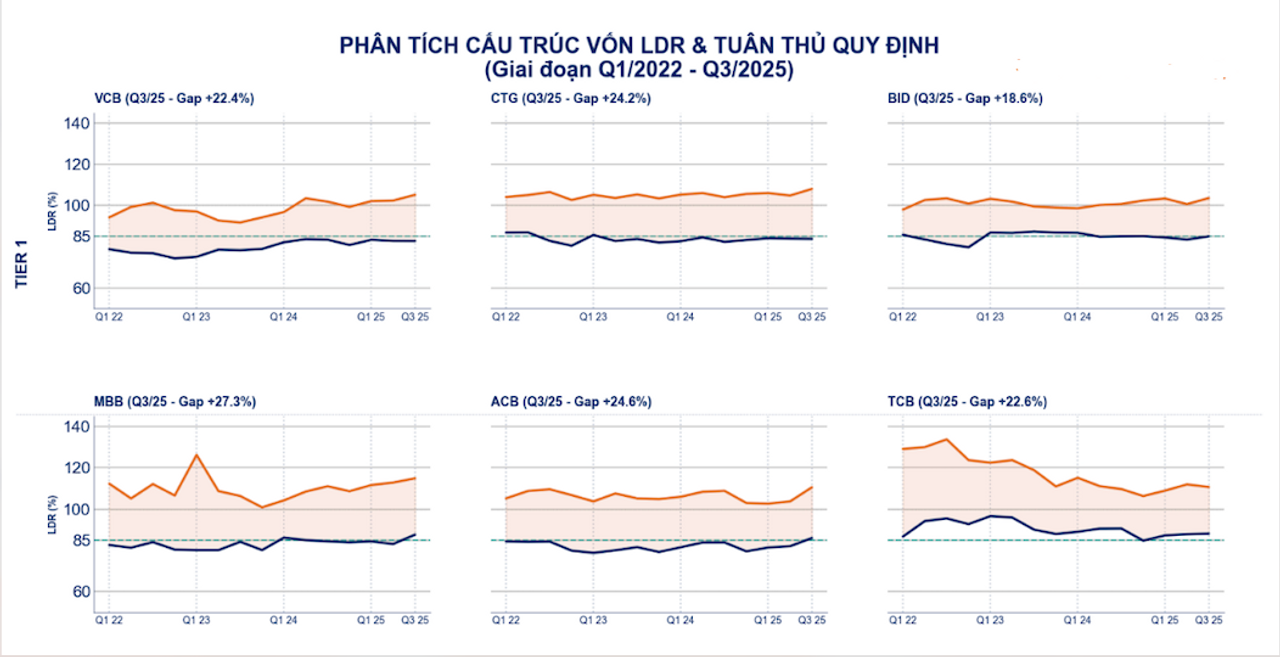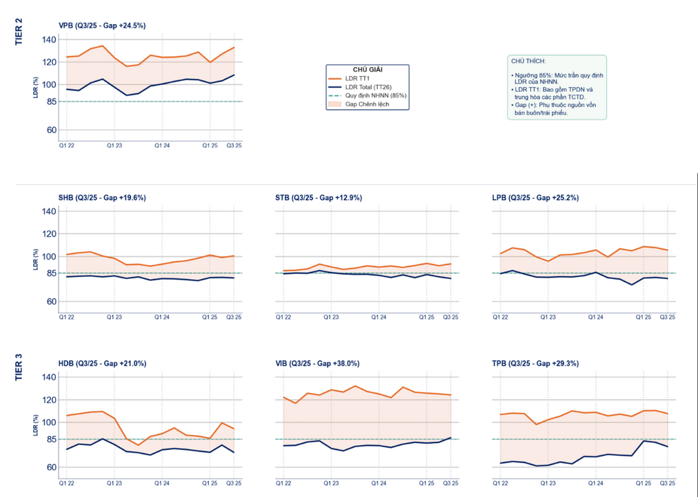 Thực tế cho thấy, dù LDR thị trường 1 (TT1) của nhiều ngân hàng đã vượt ngưỡng 85%, nhưng nếu xét trên LDR tổng (Dư nợ cho vay / [Tiền gửi TT1 + Tiền gửi TT2 + FIBOND]) thì hệ thống vẫn tạm thời duy trì quanh mức cho phép. Điều này phản ánh một thực tế quan trọng: các ngân hàng hiện nay không còn phụ thuộc chủ yếu vào nguồn tiền gửi dân cư (TT1) như trước, mà ngày càng lệ thuộc nhiều hơn vào nguồn vốn từ thị trường 2 (tức thị trường liên ngân hàng).