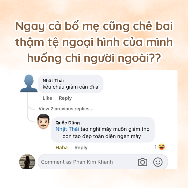 "Đừng để lời nói vô tình của ai đó (kể cả người thân) trở thành giọng nói bạn mang theo cả đời. Ngoại hình không cần phải hoàn hảo để bạn xứng đáng với sự tôn trọng."