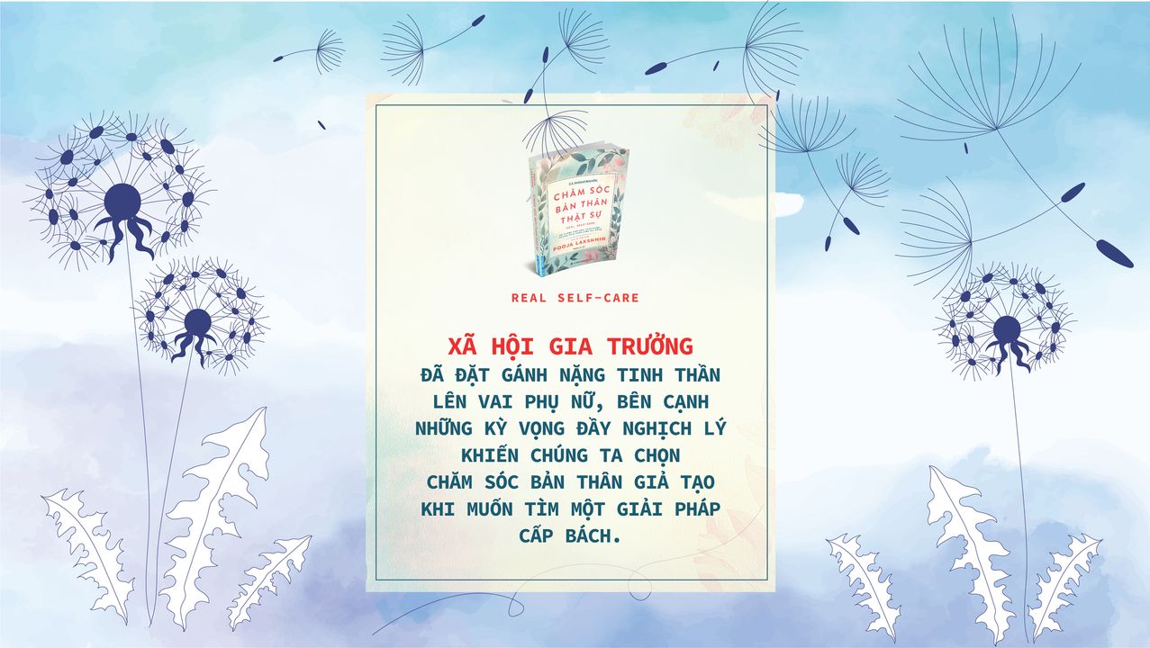Trong cuốn sách “Chăm sóc bản thân thật sự”, Pooja Lakshmin đã đưa ra những phân tích và bằng chứng cho thấy xã hội hiện nay đã đặt nhiều gánh nặng tinh thần lên phụ nữ, khiến họ kiệt sức, mất kết nối và có xu hướng gặp nhiều vấn đề về sức khỏe tâm lý như trầm cảm, lo âu… Nhưng thay vì giải quyết nguyên nhân vấn đề, chúng ta lại thực hành những phương pháp chăm sóc bản thân giả tạo và xem nó như giải pháp cho một vấn đề xã hội.