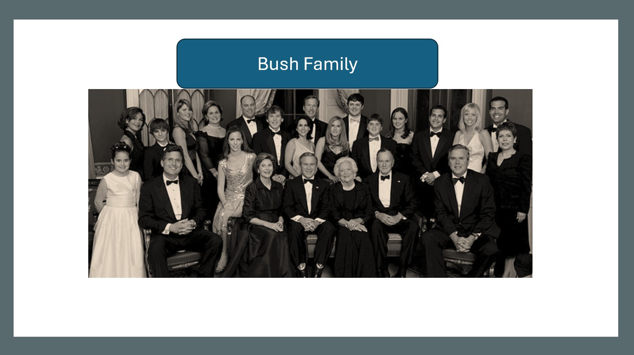 Prescott Bush, một chủ ngân hàng và thượng nghị sĩ, thể hiện sự nhấn mạnh của giới thượng lưu WASP (white Anglo-Saxon Protestant - người Tin Lành gốc Anh da trắng) vào sự ổn định và kín đáo. Đó là một di sản được truyền cho George H.W. Bush và George W. Bush, những người định hướng chính trị một cách cẩn thận, tránh phong cách đối đầu kiểu Dòng họ Kennedy.