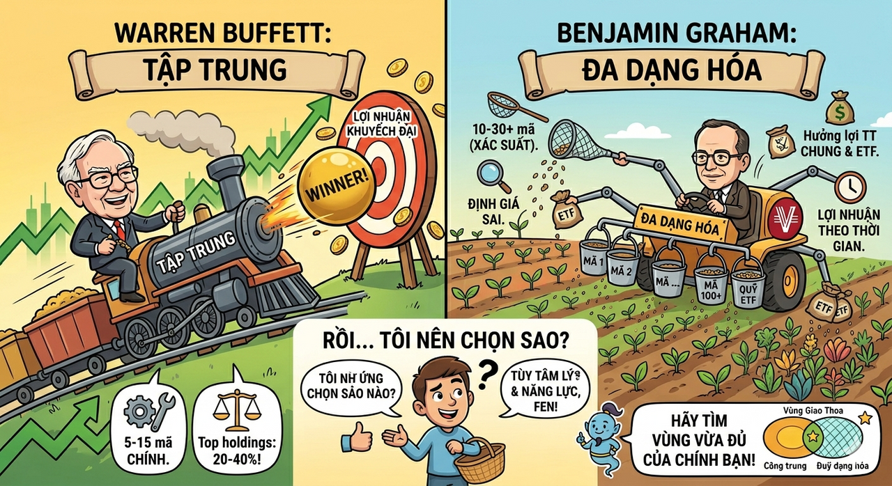 Graham hiểu rất rõ doanh nghiệp, nhưng tối đa mỗi cổ phiếu ông nắm chỉ 10%. Nếu bạn chỉ dựa những thông tin được mớm từ broker hoặc các "câu chuyện" , "mẫu hình" "dòng tiền" việc tập trung là rất rủi ro