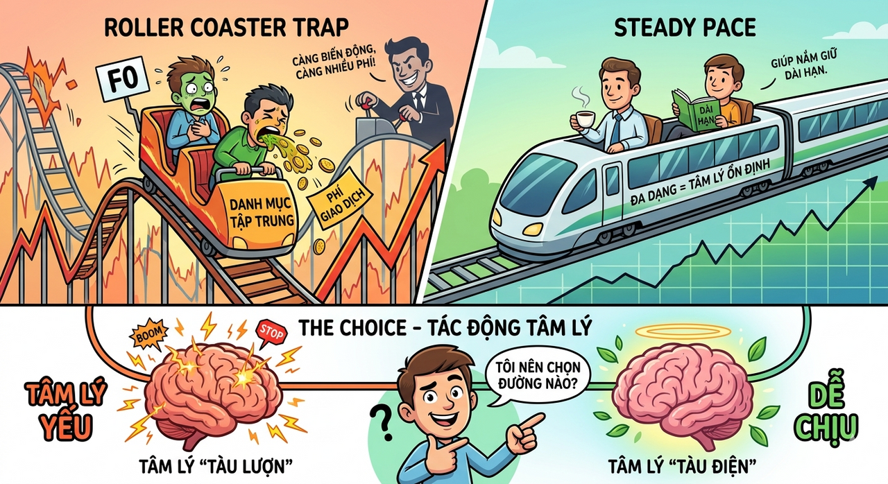 Một danh mục đa dạng sẽ khiến độ biến động ổn định hơn, giúp tâm lí dễ chịu nắm giữ được cổ phiếu dài hạn