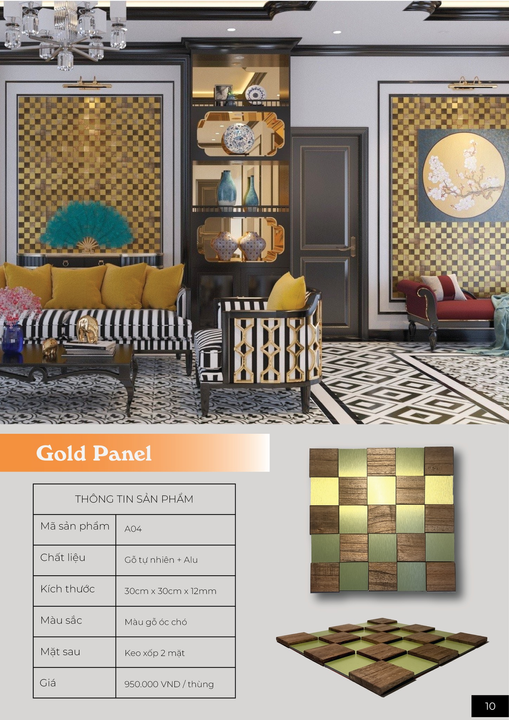 - Gold panel được sản xuất từ gỗ tự nhiên và chất kết dính, phủ thêm lớp mạ vàng tạo lên nét đẹp đẳng cấp thời thượng cho không gian sống rất phù hợp cho những ai muốn tạo điểm nhấn trong không gian