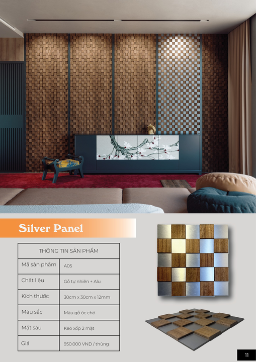 - Silver panel là loại gạch gỗ được sản xuất từ gỗ tự nhiên và chất kết dính phủ thêm lớp mạ bạc, tạo bề mặt gỗ có vẽ đẹp sang trọng