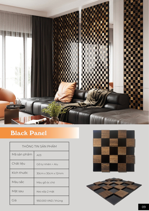 - Black panel được sản xuất từ gỗ tự nhiên kết với với Alu đen tạo nên bề mặt của gạch gỗ có sự đan xen gữa màu gỗ nghiêng về màu óc chó đậm kết hợp với màu đen alu,tạo lên nét đẹp sang trọng và hiện đại