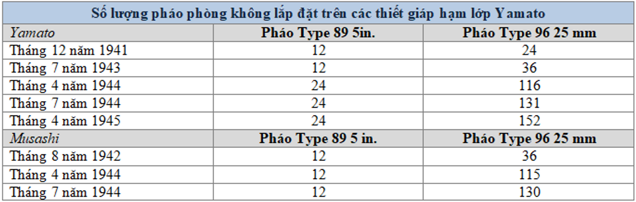 Để đối phó với mối đe dọa ngày càng lớn này, IJN đã lắp đặt ngày càng nhiều pháo phòng không trên các đơn vị hạm đội. Phần lớn trong số đó là pháo 25mm có thể bố trí hầu như bất kỳ đâu có tầm bắn thông thoáng. Các tàu khu trục mang theo tới 26 khẩu 25mm, tàu tuần dương hạng nặng thì lên tới 60 khẩu và thiết giáp hạm là hơn 100 khẩu. Như đã đề cập trước đó, Yamato và Musashi cuối cùng tự hào sở hữu lần lượt là 152 và 130 khẩu.