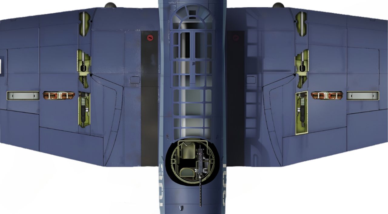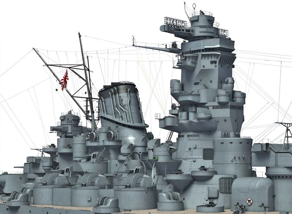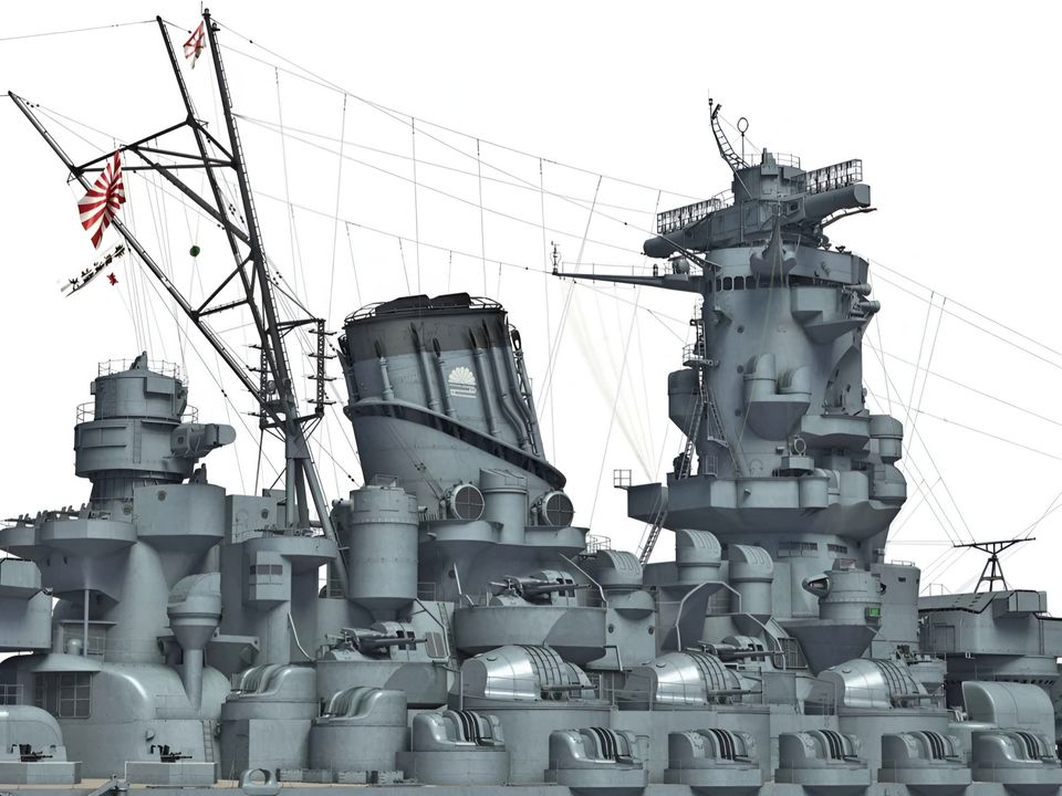 Hình ảnh này cho thấy Musashi vào tháng 10 năm 1944 khi con tàu bị đánh chìm tại Biển Sibuyan. Con tàu thể hiện một dáng vẻ vừa thanh thoát vừa đầy uy lực, nổi bật với ba tháp pháo ba nòng cỡ 18,1 inch (460 mm), ống khói nghiêng, và cấu trúc thượng tầng lớn. Điều khó nhận ra ngay là hệ thống phòng không hùng hậu của Musashi, gồm 130 pháo phòng không 25 mm được bố trí trong 35 bệ ba nòng (phần lớn tập trung ở khu vực giữa tàu) và 25 bệ một nòng (trên boong trước và sau). Các vũ khí hạng nhẹ này được tăng cường bởi 12 khẩu pháo 5 inch Type 89 (3 bệ hai nòng có thể thấy ở giữa tàu gần ống khói) và hai tháp pháo 6,1 inch của dàn pháo hạng hai. Mặc dù hệ thống vũ khí này có thể tạo ra mật độ hỏa lực rất ấn tượng, nó đã tỏ ra kém hiệu quả trong việc bảo vệ con tàu trước một cuộc tấn công trên không kéo dài.