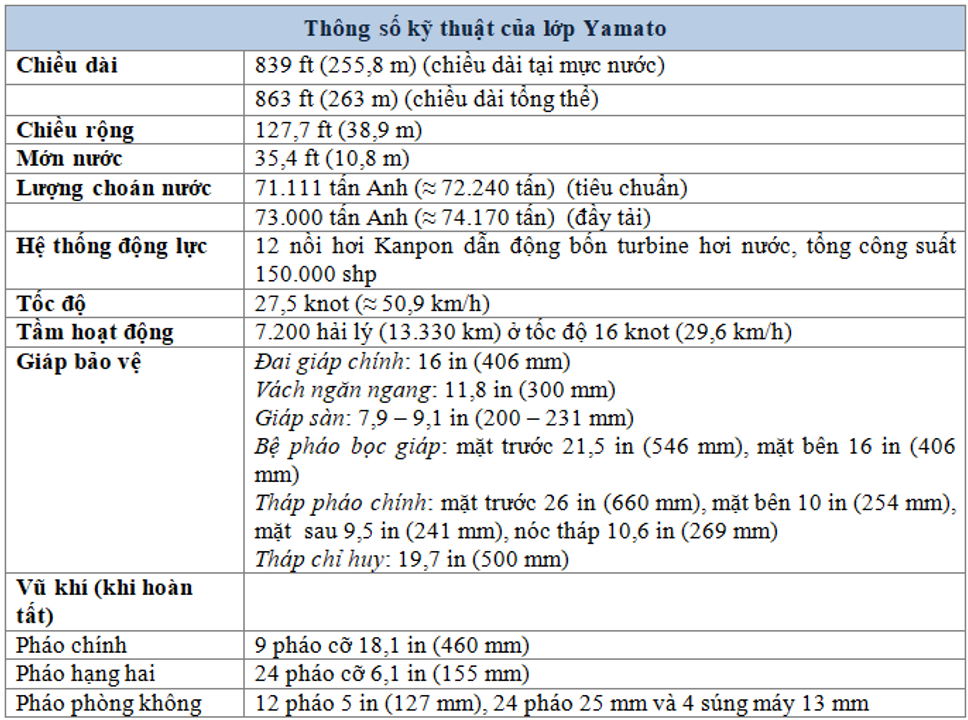 Yamato (大和, Đại Hòa) và Musashi (武蔵, Vũ Tàng) là những thiết giáp hạm lớn nhất từng được đóng. Chúng được thiết kế không chịu bất kỳ hạn chế nào nhằm đạt được ưu thế vượt trội về chất lượng so với mọi thiết giáp hạm mà các đối thủ tiềm tàng có thể triển khai. Vì vậy, chúng được trang bị mức độ bảo vệ cao nhất có thể. Điều này sẽ được thử thách vào giai đoạn cuối của cuộc chiến, khi những con tàu này không đối đầu với một thiết giáp hạm Mỹ, mà thấy vào đó là với từng đợt từng đợt máy bay từ các tàu sân bay Mỹ.