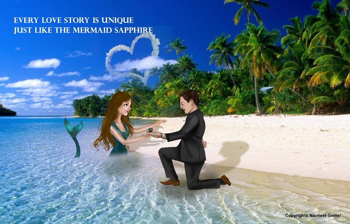 Cô không biết rằng cô đang bị theo dõi bởi một người đàn ông đã yêu cô ngay từ cái nhìn đầu tiên đến nỗi anh ta không thể rời mắt khỏi cô. Những lớp vảy màu xanh lam đầy mê hoặc của cô ấy dường như đổi màu theo từng tia nắng, khiến cô ấy trở thành thứ đẹp nhất mà anh từng thấy. Anh đến gần cô một cách thận trọng, sợ rằng anh có thể làm cô sợ hãi. Cô há hốc mồm ngạc nhiên ngay khi nhìn thấy anh và có thứ gì đó rơi khỏi tay cô. Nó trông giống như một mảnh ghép của chính cô ấy, nó cũng kỳ diệu giống như cô ấy! Anh ta nhặt viên đá quý lên và lẩm bẩm, "Viên sapphire của nàng tiên cá (Nên chọn cướp lấy viên đá quý kia hay trái tim của cô gái xinh đẹp đây ? “- ". Trong khoảnh khắc đó, anh ấy đã cảm nhận rằng viên đá quý này là báo hiệu cho câu chuyện tình yêu độc đáo của riêng họ và anh ấy đã dâng nó lại cho cô ấy, hẹn ước một tình yêu vĩnh cửu bên nhau.