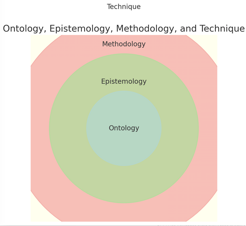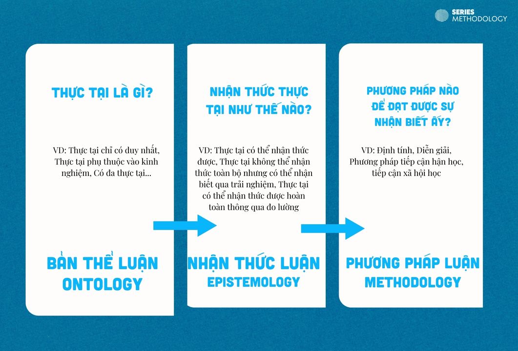 Bản thể luận (Ontology): Đây là lớp liên quan đến bản chất của thực tế, trả lời câu hỏi: "Thực tế là gì?" Lớp này định hình cách nhà nghiên cứu nhìn nhận thế giới và thực tại.