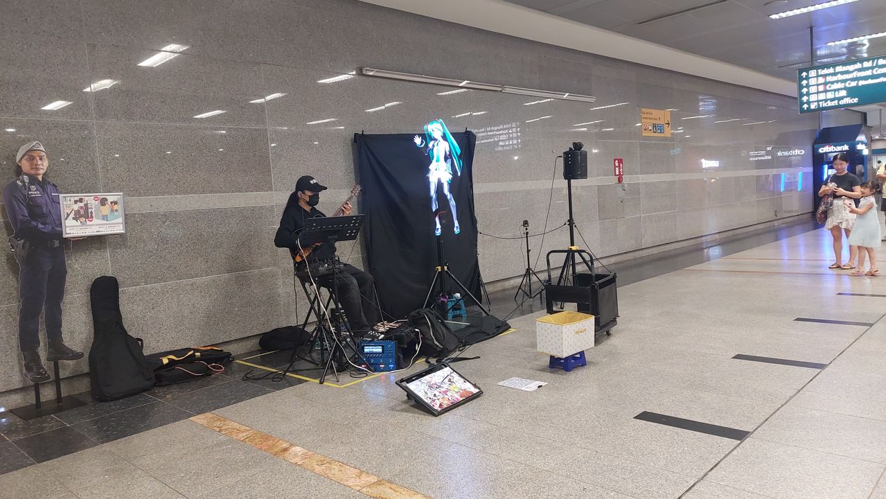 Ở lối lên Vivo city, mình thấy anh nghệ sĩ này đang biểu diễn. Anh không hát mà chỉ đánh đàn thôi rồi chiếu màn hình bên cạnh cho búp bê AI hát, ann đánh rất say mê. Mình đứng nghe 1 lúc rồi có gửi anh 5SGD vào thùng. Chúc anh nhiều sức khỏe để tiếp tục đam mê của bản thân. ✊️✊️✊️