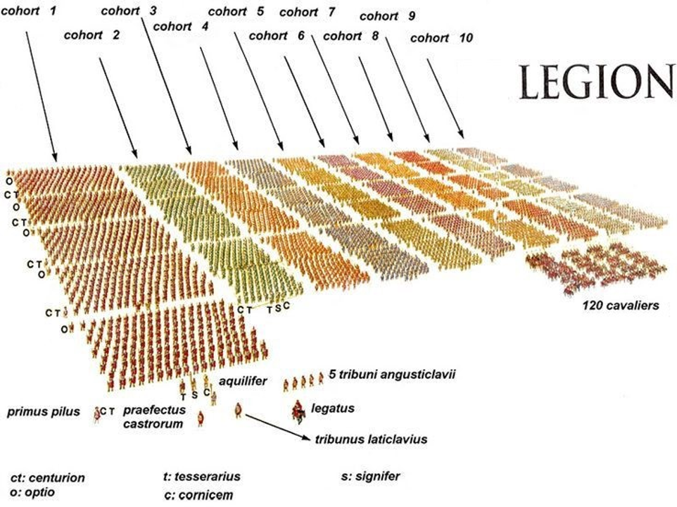 Quân đội La Mã được cấu thành từ các quân đoàn. Quân số của một quân đoàn La Mã tiêu biểu biến đổi theo thời gian. Trong giai đoạn Cộng hòa thì mỗi quân đoàn có 4200 người chia thành 30 đến 35 tiểu đoàn, mỗi tiểu đoàn có từ 120 đến 140 người. Sang giai đoạn Đế chế thì mỗi quân đoàn tăng lên thành 5200 người, cộng thêm quân đồng minh hỗ trợ chia làm 10 đại đội. Vì các quân đoàn thường trực chỉ được tổ chức trong hệ thống quân đội La Mã sau cải cách của Marius năm 107 TCN, còn trước đó chỉ mang tính nhất thời (tức là được thành lập, sử dụng khi cần thiết và sau đó giải tán) nên hàng trăm quân đoàn đã được đặt tên và xếp số thứ tự trong lịch sử La Mã. Đến nay, chỉ có khoảng 50 quân đoàn có thể xác định được rõ ràng. Trong thời kỳ đầu của Đế chế, thường có 25 đến 35 quân đoàn thường trực cùng với quân đồng minh và sẽ được tăng thêm khi cần thiết. Ngoài quân đội thường trực, sau này vào thời kỳ Đế chế, các Hoàng đế còn có một đội cận vệ riêng gọi là các Praetoriani - tức Cận vệ của Hoàng đế. Đội quân này có khoảng từ 4000 - 5000 trong thời kỳ đầu và về sau nhiều Hoàng đế thậm chí có tới 12,000 đến 15,000 lính cận vệ. Điều thú vị nhất là trong giai đoạn khủng hoảng và suy yếu của Đế chế cuối thế kỷ 3 và đầu thế kỷ 4; chính các Praetoriani lại thường xuyên là những kẻ gây ra cái chết cho Hoàng đế, vì vô vàn lý do khác nhau.