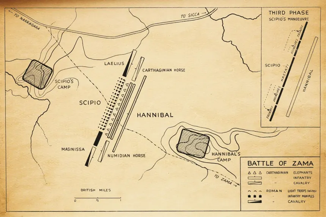 Trong khi đó, những con voi còn lại đã bị nhử đi qua các khoảng trống nhỏ mà bộ binh La Mã tạo ra, và chúng bị dụ đến tận đằng sau. Kế hoạch xử lý đám voi chiến của Scipio coi như đã thành công. Quân La Mã sau đó lập tức quay trở lại đội hình truyền thống và đánh mạnh vào trung quân của Carthage. Cuộc giao tranh giữa bộ binh hai bên kéo dài và cực kỳ ác liệt, thậm chí có những lúc tưởng như Hannibal đã giành được lợi thế. Nhưng Scipio đã duy trì được trật tự các hàng ngũ và chống trả quyết liệt. Cho đến khi các đội kỵ binh La Mã thôi không truy đuổi nữa mà quay về đánh mạnh vào hậu quân Carthage thì trận chiến dần ngã ngũ. Đội hình Carthage sụp đổ do bị đánh mạnh từ cả hai phía - kết quả gần giống y hệt trận Cannae, chỉ khác giờ đây Hannibal là nạn nhân. Carthage đón nhận thất bại nặng nề - 20,000 người bỏ mạng, và số người bị bắt cũng tương đương. Hannibal may mắn rút lui được cùng số ít tàn quân, nhưng kết cục đã rõ ràng. Scipio sau đó được gọi bằng cái tên mới là Scipio Africanus để tôn vinh chiến thắng ông giành được tại châu Phi.