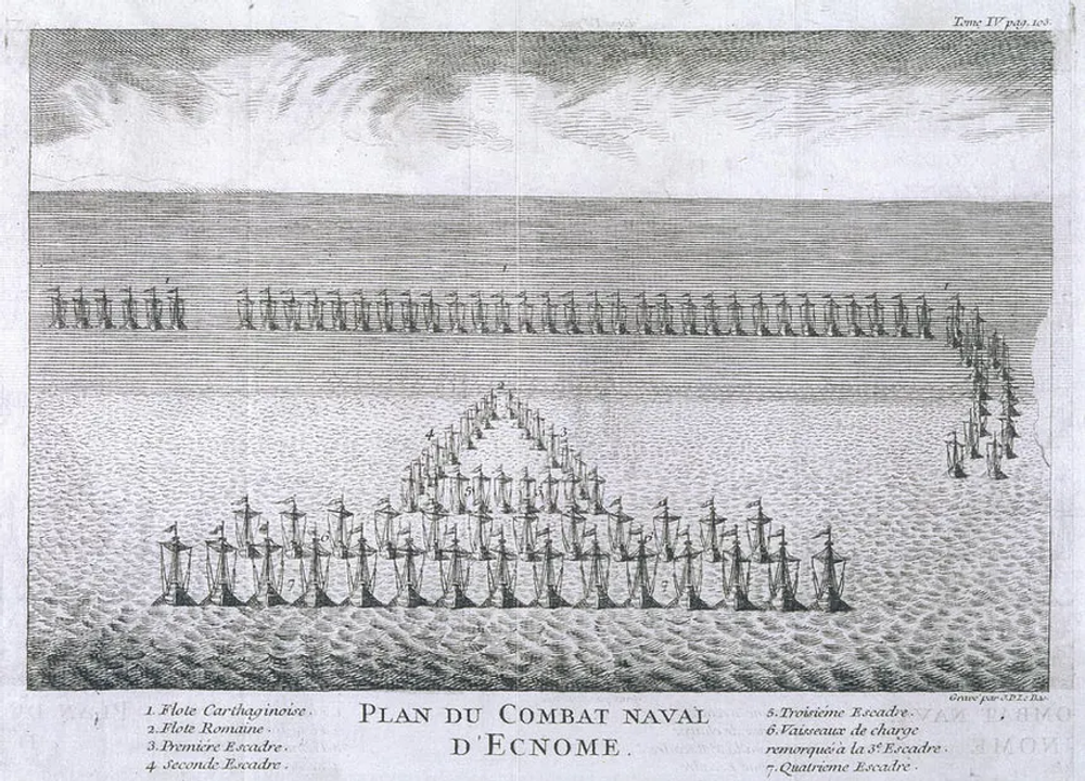 Đến thời điểm này, chiến thuật hải quân La Mã đã được cải tiến rất nhiều. Hạm đội tiến dọc theo bờ biển Sicily, và các tàu chiến được chia thành ba đội. Đích thân hai Quan chấp chính của La Mã chỉ huy hai đội, dàn các tàu thành hình cái nêm. Phần lớn các tàu vận tải đều di chuyển phía sau họ và được đội tàu thứ ba đi sau bọc lưng. Hạm đội Carthage thì được bố trí theo đội hình trường tuyến truyền thống, hầu hết các tàu đều xếp dàn thành hàng ngang để đón địch.