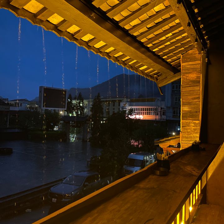 Cầm ly nước ấm, mình ra ban công hít thở, tự cảm thấy - wow, thật tuyệt vời. Ở Phiên, mưa lúc nào cũng đẹp, kể cả trời mưa đêm - hay lúc rạng sáng. Thế mà mãi cho đến bây giờ mình chỉ ngắm nhìn mọi thứ ban ngày.