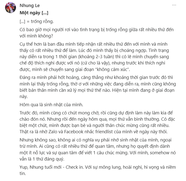 Tháng tư luôn là tháng mình khá tất bật với cuộc sống. Thế mà chỉ cần bước vào đầu tháng 4 là mình đã cảm thấy vui rồi, một chút “hồi hộp”, hào hứng trong lòng chờ ngày mừng bản thân thêm 1 tuổi. Lạ thay, mình chỉ có cảm xúc đó trước và sau ngày sinh nhật thì phải ?! Vào ngày sinh nhật, mình thường hụt hẫng. Cảm thấy nó cũng như một ngày bình thường, không có nhiều thứ làm mình vui như mình nghĩ từ những ngày trước đó.