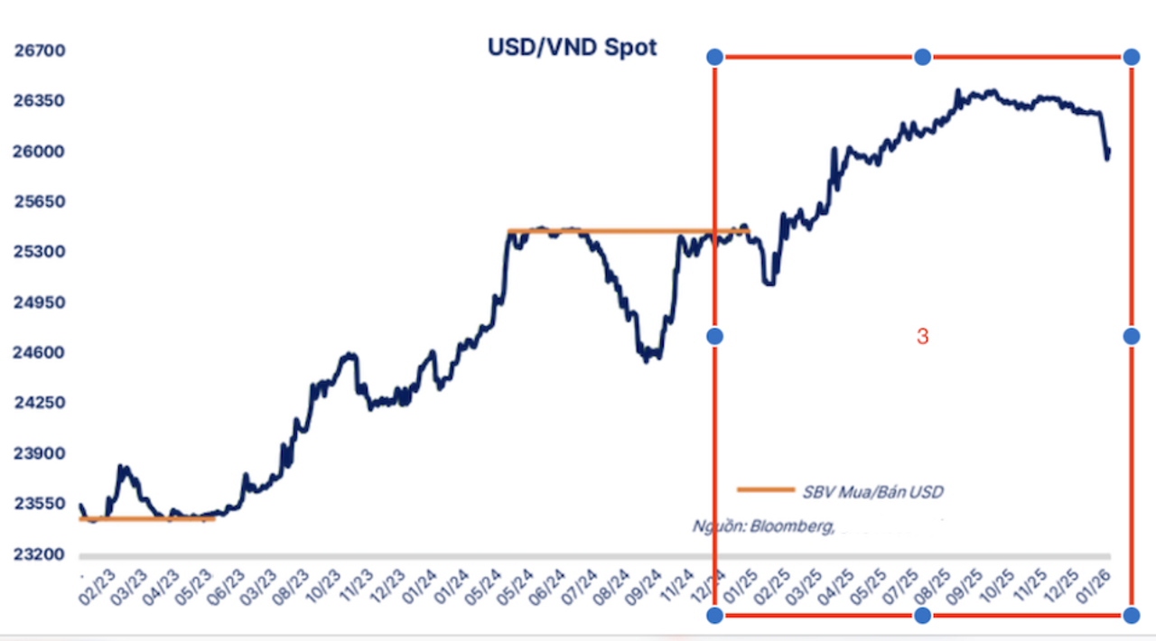 Thì như đã nói ở trên do lãi suất của VN được duy trì thấp suốt 9 tháng đầu 2025, lãi suất trong nước thấp kéo dài. Có lúc, SWAP còn âm ở kỳ hạn ngắn, khiến áp lực lên tỷ giá tăng lên. Thêm nữa, vì ưu tiên tăng trưởng đầu năm, thanh khoản VND dồi dào do cung tiền nội suy được tăng mạnh từ cả kênh tín dụng và đầu tư công từ KBNN, nên VND yếu đi nhanh hơn so với nhiều đồng tiền trong khu vực. Dù DXY đang trong giai đoạn undervalued, nhưng VND vẫn giảm tương đối mạnh hơn (thể hiện ở chỗ performance của VND so với USD nếu so với các đồng tiền khác trong khu vực , nên tỷ giá USD/VND cả nửa năm nay tăng một cách khủng khiếp) và đó là lý do khiến USD/VND tăng đáng kể trong nửa năm vừa qua. Đến khoảng tháng 10, SBV bắt đầu giữ lãi suất liên ngân hàng cao hơn, qua đó kéo chênh lệch lãi VND-USD (SWAP) về trạng thái dương ổn định ở các kỳ hạn. Khi SWAP được giữ dương đủ lớn, từ đó giữ cho dòng ngoại tệ không bị thất thoát ra ngoài và thêm điều kiện đủ để tận dụng dòng ngoại tệ chủ động vào. Kết quả là tỷ giá hạ nhiệt, cuối tháng có những phiên giảm và có lúc xuống dưới 26.000 VND/USD, đúng với định hướng kiểm soát tỷ giá của SBV.