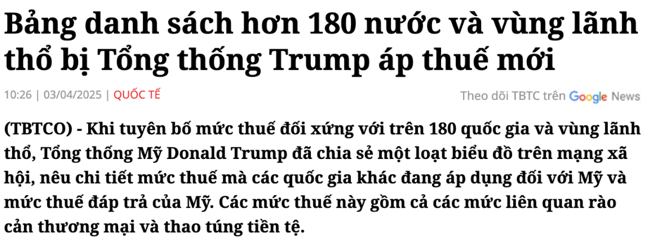 Đầu tiên không thể mà không nhắc tới, sự kiện kinh tế nổi bật nhất đó là việc nhân vật “chí phèo” mà ai cũng biết, bỗng một ngày đẹp trời gã ta nổi điên lên áp thuế 10%, toàn bộ những mặt hàng nhập khẩu và add thêm thuế cho những nước mà gã ta cho là “lừa dối” nước của gã trong việc làm ăn và Việt Nam ta cũng không nằm ngoài, khi bị áp một mức thuế khá “VÔ LÝ” lên tới 46%.