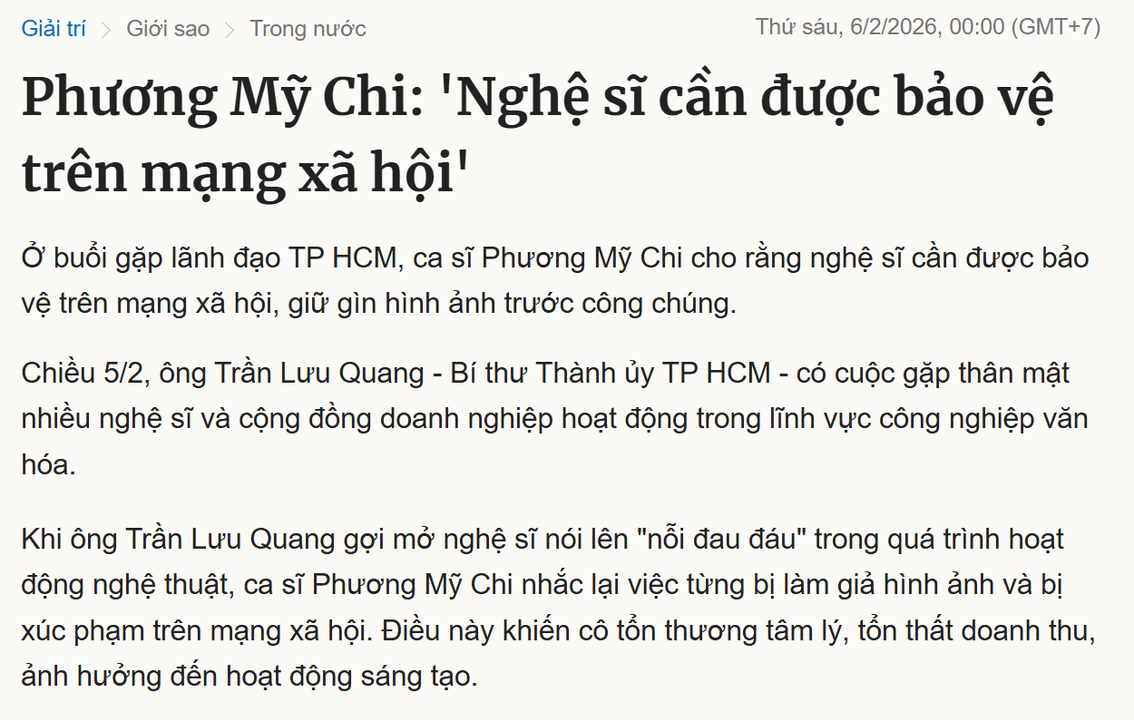 Nói tóm lại, bối cảnh bài báo này, nếu tôi đọc đúng và đọc đủ, thì nó không phải một buổi công bố chính sách cụ thể, cũng không phải một tuyên bố kiểu “xin đặc quyền” được chuẩn bị từ trước. Nó là một bài tường thuật lại một khoảnh khắc chia sẻ, nơi Phương Mỹ Chi đang nói từ vị thế của một người đã từng bị hại, từng trải qua một vụ việc khiến danh tính và hình ảnh của mình bị lôi ra làm trò trên mạng, rồi từ trải nghiệm đó mới nảy ra một câu kiến nghị mang tính rất người: khi bị tấn công theo cách mình không tự chống đỡ nổi, mình muốn có một cơ chế giúp mình không bị nghiền nát bởi thứ hỗn loạn kia.