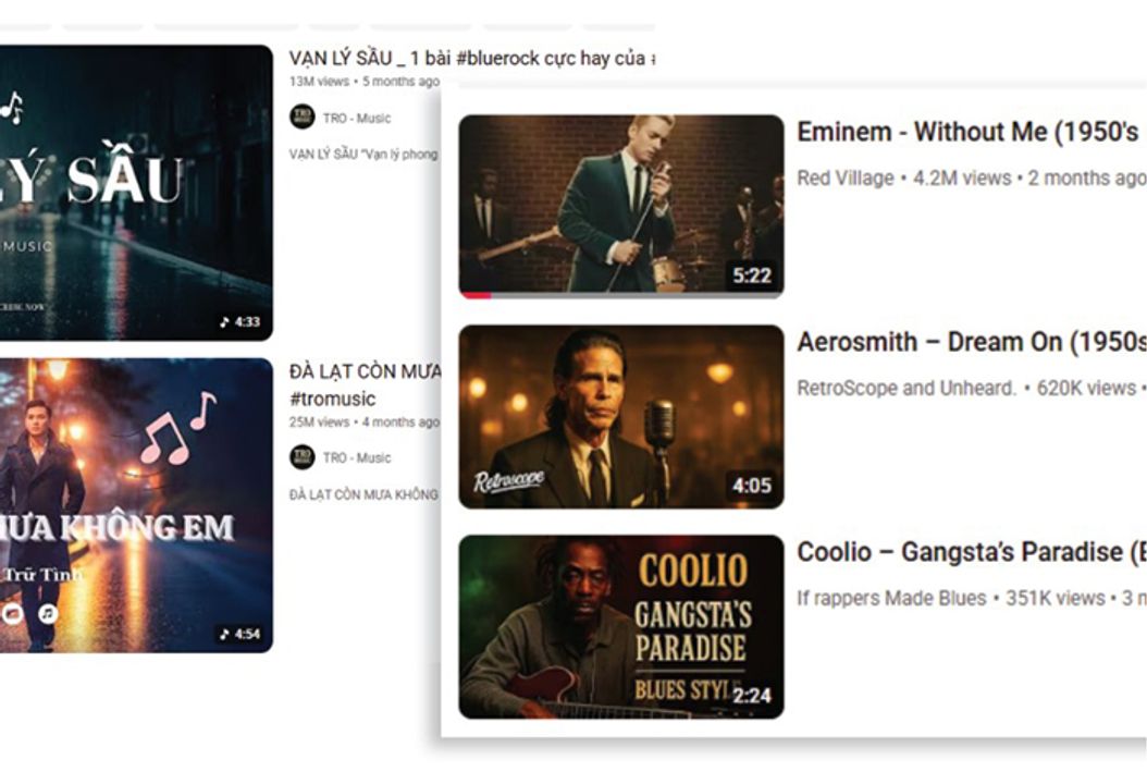 Các bạn hãy nhìn mấy kênh Youtube này, nó chuyên phát hành nhạc AI được sáng tạo dựa trên các bản hit cũ. Nhạc AI làm, giọng AI hát, video được dựng dựa trên artwork vẽ bởi AI.