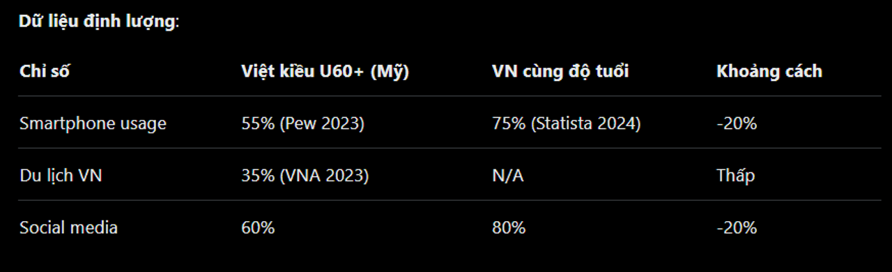 Khảo sát của Pew Research (2022) chỉ ra rằng chỉ 60% người Việt lớn tuổi tại Mỹ sử dụng mạng xã hội thường xuyên, trong khi nhiều người vẫn trung thành với điện thoại nắp gập Nokia Lumia.
