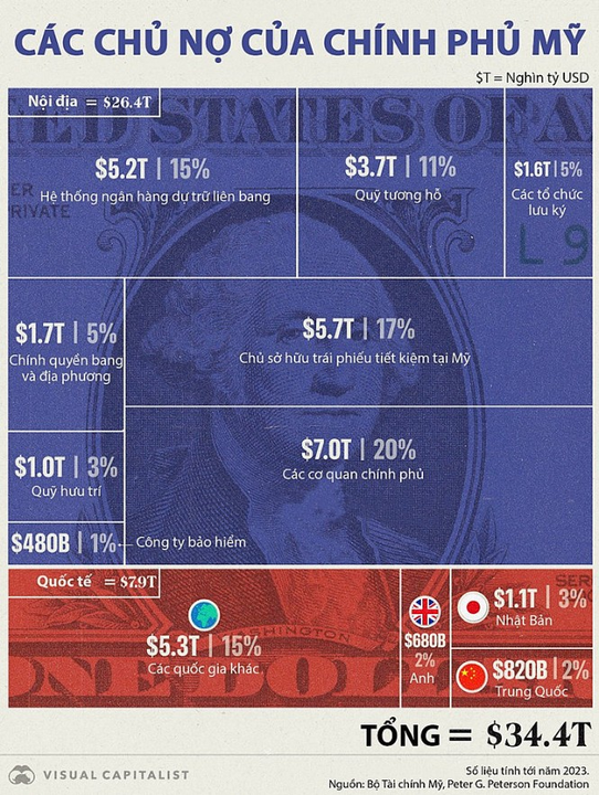 - Đầu tiên là các chủ nợ trong nước (Domestic Holders): Họ mới chính là những người nắm giữ phần lớn nhất, chiếm hơn hai phần ba, tương đương khoảng 20,3 nghìn tỷ đô la. Những chủ nợ này bao gồm