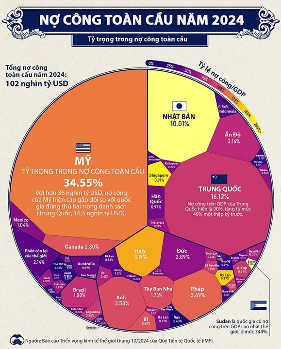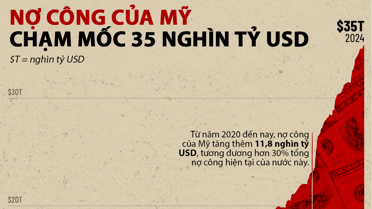 Con số này lớn đến mức khó có thể hình dung khi nó lớn hơn GDP của bốn nền kinh tế hùng mạnh bậc nhất thế giới hiện này là Trung Quốc, Nhật Bản, Đức và Ấn Độ cộng lại. Ấy thế mà đây lại là số nợ công của Mỹ tính đến năm 2025. Mỗi ngày, nó lại phình to thêm trung bình gần 8 tỷ đô la theo số liệu năm 2024. Mỗi đứa trẻ sơ sinh ở Mỹ chào đời đã phải gánh trên vai khoảng 108.000 đô la của món nợ quốc gia này.