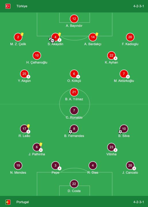 Dưới sự dẫn dắt của Vincenzo Montella, Thổ Nhĩ Kỳ đã chọn đội hình 4-2-3-1 thận trọng nhằm mục đích kiềm tỏa sự sáng tạo của đối thủ và phản công khi có thể. Tuy nhiên, hàng thủ của họ liên tục bị xé toang bởi lốidi chuyển linh hoạt cùng những đường chuyền sắc bén của Bồ Đào Nha. Bộ đôi tiền vệ Hakan Çalhanoğlu và Orkun Kökçü đã gặp khó khăn trong việc kiềm tỏa Fernandes và Vitinha, khiến hàng thủ càng trở nên mong manh.