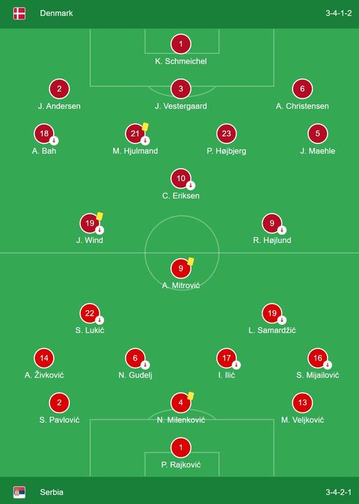 Được dẫn dắt bởi Kasper Hjulmand, Đan Mạch chọn sơ đồ 3-4-3, dựa vào cấu trúc phòng ngự vững chắc và khả năng chuyển đổi nhanh sang tấn công. Họ tập trung vào việc không cho Serbia có khoảng trống ở khu vực giữa sân và khai thác hàng thủ dâng cao của đối phương bằng những đường chuyền trực tiếp, cùng những pha chạy chỗ sau lưng hàng phòng ngự.