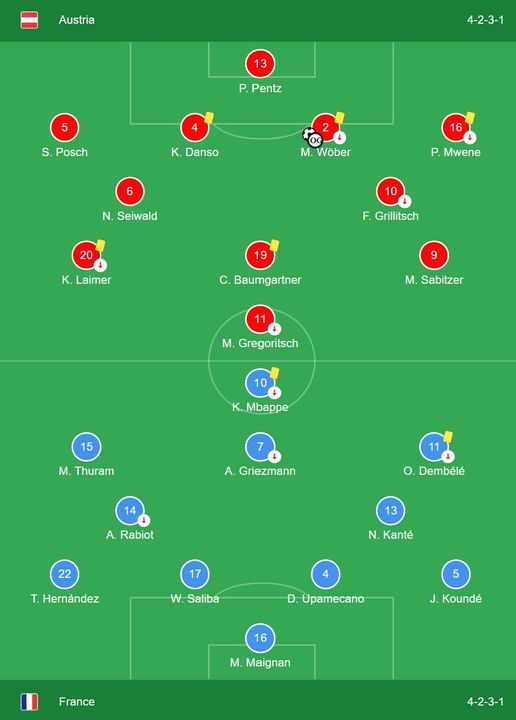 3/ Bàn thắng duy nhất của Pháp đến từ một pha phản lưới nhà vô duyên của Wober bên phía Áo. Một quả tạt từ Mbappé đã gây ra sự hỗn loạn trong hàng phòng ngự của Áo, và Wober vô tình đưa bóng vào lưới nhà. Đó là một may mắn cho Pháp, đội đã chật vật để tạo ra những cơ hội rõ ràng.
