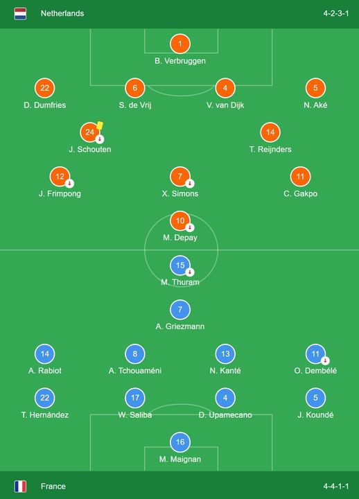 Pháp sử dụng sơ đồ 4-4-1-1, ưu tiên sự vững chắc phòng ngự đồng thời tìm cách khai thác các cơ hội phản công. Hàng thủ của họ, dẫn đầu bởi William Saliba ấn tượng, duy trì một tuyến chơi cao, vô hiệu hóa những nỗ lực đưa bóng tới tiền đạo M. Depay của Hà Lan. N'Golo Kante và Tchouameni đã bảo vệ hàng thủ một cách hiệu quả, phá vỡ lối chơi và khởi xướng các đợt chuyển đổi trạng thái.