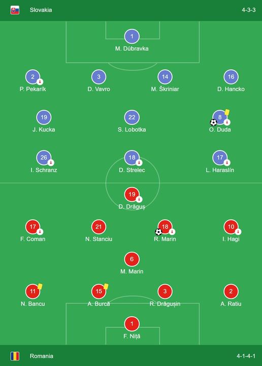 Slovakia bắt đầu trận đấu với thế trận trên chân, áp dụng cách tiếp cận pressing tầm cao nhằm phá vỡ lối chơi của Romania. Juraj Kucka và David Hancko có những cơ hội đầu tiên cho Slovakia. Tuy nhiên, Romania đáp trả bằng những đợt tấn công của riêng họ, với việc Andrei Ratiu thử thách thủ môn Martin Dubravka của Slovakia.