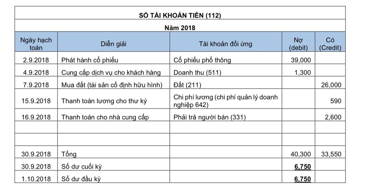 Hình ảnh trên minh hoạ 1 tài khoản trong sổ cái là tài khoản Tiền. Ví dụ với giao dịch 1 là phát hành cổ phiếu phổ thông và thu được 39.000, tiền tăng 39.000 thì sẽ được ghi nhận vào bên Nợ của tài khoản Tiền (như trong hình). Và giao dịch phát hành cổ phiếu phổ thông cũng ảnh hưởng tới tài khoản Cổ phiếu phổ thông (được ghi nhận bút toán ngược lại với tài khoản Tiền là ghi bên Có/Credit), nên tài khoản đối ứng trong trường hợp này chính là Cổ phiếu phổ thông.