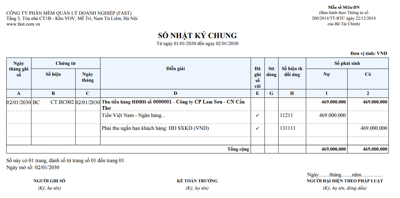 Hình ảnh trên là ví dụ minh hoạ cách một giao dịch sẽ được ghi vào sổ nhật ký chung như thế nào. Với giao dịch thu tiền hàng từ khách đã mua chịu trước dó, tài khoản Tiền gửi ngân hàng (11211) sẽ tăng nên ta ghi Nợ/Debit tài khoản này với số tiền tương ứng là 469.000.000, khoản Phải thu khách hàng (11311) giảm nên ta ghi Có/Credit tài khoản Phải thu khách hàng với số tiền tương ứng bên cột ghi Có là 469.000.000.